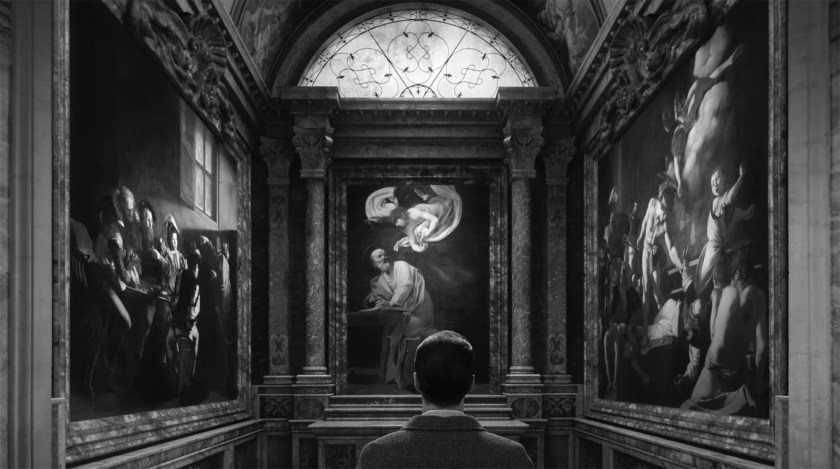 Tom Ripley contempla Caravaggio nella Cappella Contarelli della Chiesa di San Luigi dei Francesi a Roma, in Ripley, Netflix, 2024