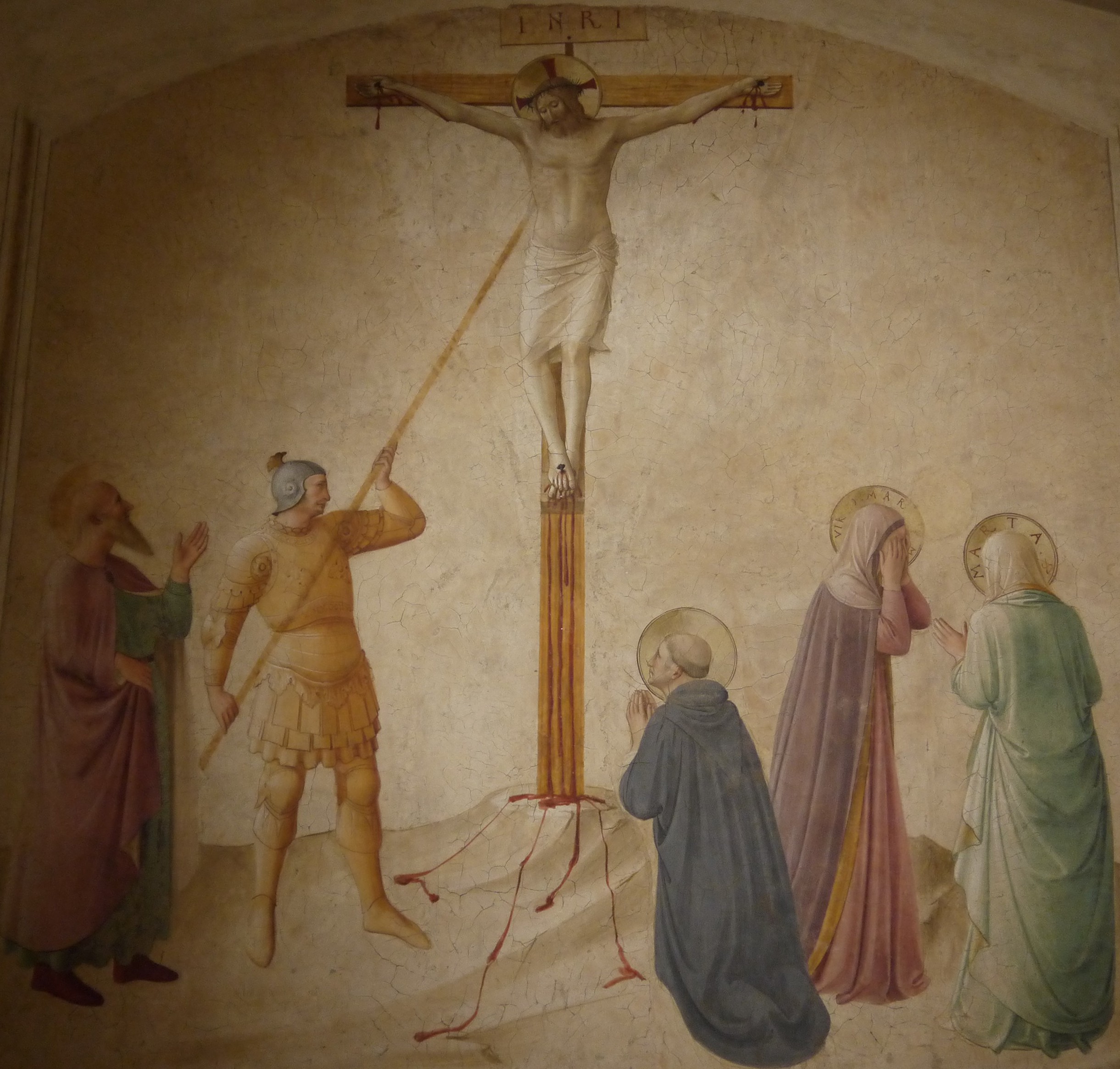 Probabilmente, l’unica vera e indiscutibile eccezione del canone angelichiano. Coevo e simile, dal punto di vista compositivo, al Compianto della cella 2 del Convento di San Marco, dove, però, il “canone” è rispettato.